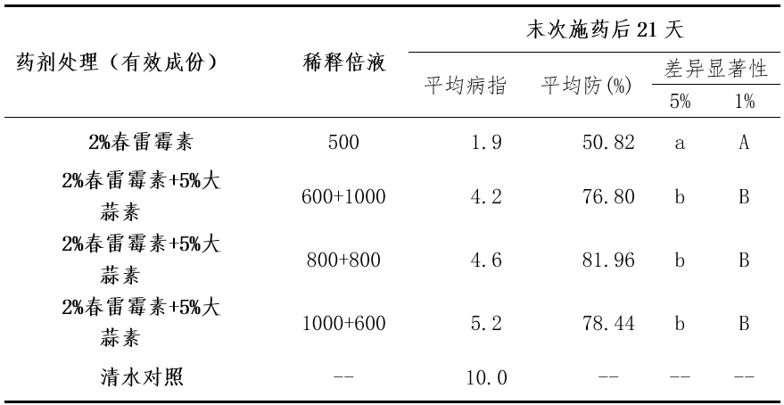 實(shí)驗結果通過(guò)Duncan’s新復極差法進(jìn)行方差分析表明,田間試驗反饋數據結果中,5%大蒜素微乳劑與2%春雷霉素組間防治效果差異不顯著(zhù),5%大蒜素微乳劑完全能夠達到化學(xué)藥劑2%春雷霉素相同的防治效果。而單劑與復配處理組間的防治效果差異達到顯著(zhù)性水平。2%春雷霉素加5%大蒜素兩者復配后防效有顯著(zhù)性提高,當兩者均稀釋800倍液后復配防治效果最為顯著(zhù)。