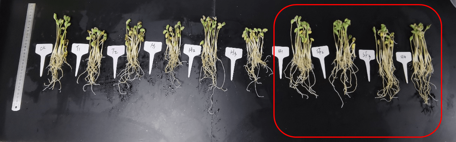 (2)測試了在低溫與高溫條件下,花粉多糖對大豆幼苗生長(cháng)的影響。對比其他生物刺激素,花粉多糖在高低溫逆境條件下,可顯著(zhù)促進(jìn)大豆根長(cháng)、莖粗及鮮重增加,其中高溫條件下大豆根長(cháng)根重分別增加了20.45%、55.58%,顯著(zhù)優(yōu)于其它生物刺激素效果。