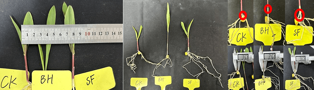 (1)針對玉米作物:在14℃~22℃培養條件下,對比其他種子處理劑,采用50g/100kg花粉多糖進(jìn)行玉米拌種處理,試驗27天后發(fā)現,花粉多糖處理后玉米株高生長(cháng)雖弱于其他種子處理劑,但莖粗、根鮮重、氣生根長(cháng)出率及氣生根根長(cháng)均顯著(zhù)優(yōu)于,其中明顯看出其他種子處理劑處理后,玉米未生長(cháng)出氣生根。說(shuō)明花粉多糖拌種玉米,可明顯增加玉米氣生根生長(cháng),提升玉米后期抗倒伏能力。