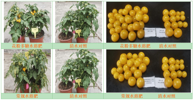 (1)對比常規水溶肥與花粉多糖水溶肥,葉噴處理后,花粉多糖水溶肥能顯著(zhù)促進(jìn)番茄中可溶固形物累計,提高番茄品質(zhì);提高小番茄果實(shí)產(chǎn)量,單果重增長(cháng)率達到12.45%。