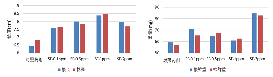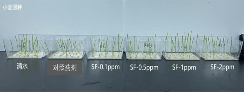 (2)針對小麥作物:浸種處理后發(fā)現,試驗范圍內的花粉多糖對小麥株高、根長(cháng)、株重、根重均具有促進(jìn)作用,其中在2 ppm處理下,相比陽(yáng)性對照處理,花粉多糖處理后小麥株高、根長(cháng)、株重及根重分別增長(cháng)12%、24%、45%、43%。
