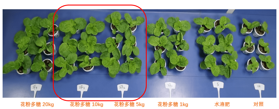 (1)花粉多糖復配水溶肥提效增產(chǎn)。在水溶肥中添加5-10kg/t花粉多糖,可促進(jìn)小白菜光合作用,顯著(zhù)提高葉綠素含量10.97%,促進(jìn)小白菜葉片生長(cháng),地上部生物量增加34.0%-41.78%;同時(shí),水溶肥復配花粉多糖,能提高小白菜的營(yíng)養品質(zhì),促進(jìn)葉片Vc含量及可溶性糖含量積累。