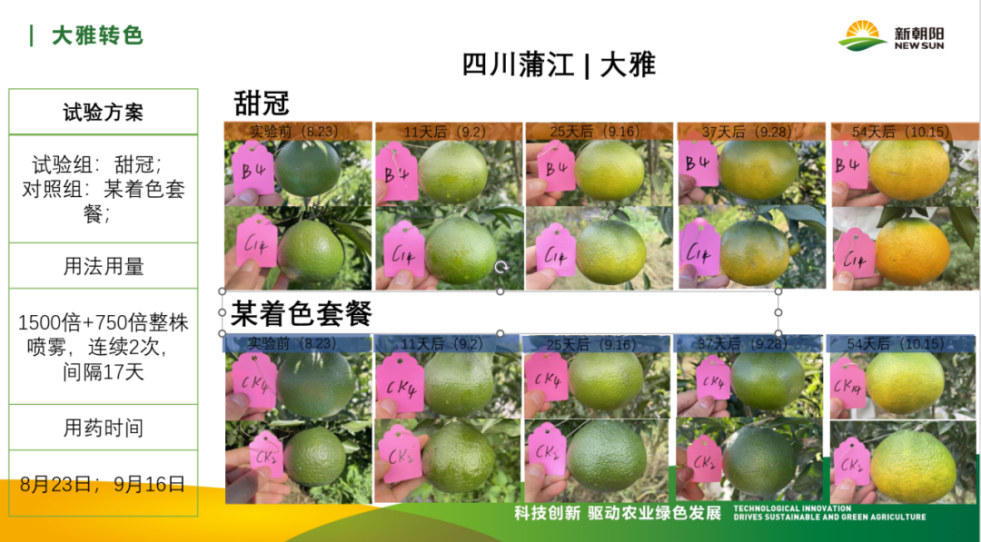 甜冠(冠菌素)適用于各類(lèi)柑橘品種,如愛(ài)媛、金秋砂糖橘、砂糖橘、冰糖橙、金桔、沃柑、耙耙柑、不知火等。促進(jìn)果實(shí)轉色、顏色紅潤,表皮靚麗,提升干物質(zhì)積累,如提升糖度、芳香味物質(zhì)積累,提高果實(shí)品質(zhì),提前上市,提升抗逆性,延長(cháng)果實(shí)留樹(shù)保鮮和果實(shí)貨架期,減少流通環(huán)節損耗。